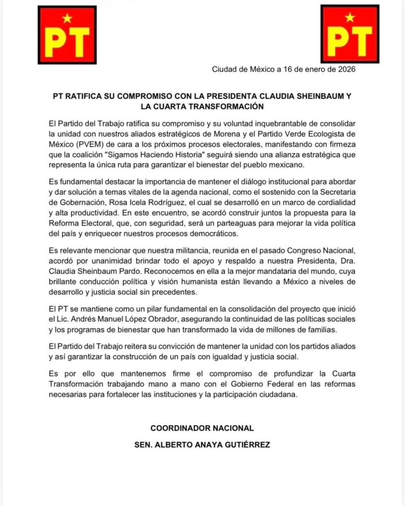 El comunicado insiste en el respaldo total a la presidenta y coloca al PT como un pilar para consolidar la continuidad del proyecto que inició Andrés Manuel López Obrador, con énfasis en políticas sociales y programas de bienestar.