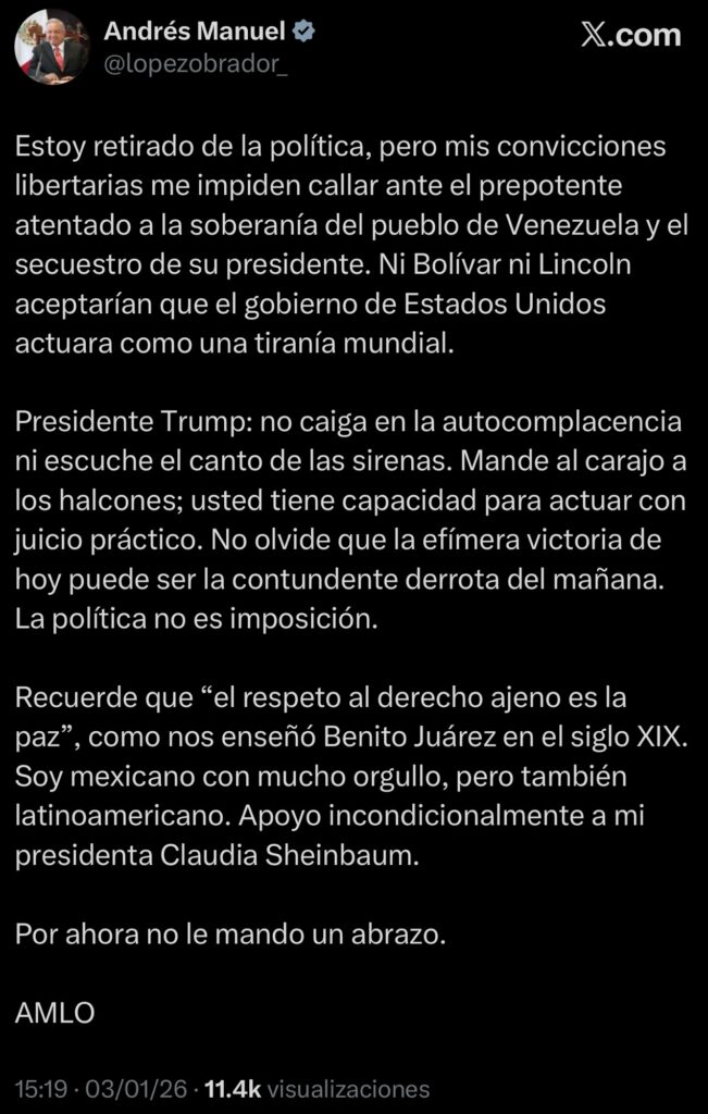 - Aunque se ha declarado retirado de la política, Andrés Manuel López Obrador reapareció este viernes en redes sociales con un mensaje de alto voltaje político: condenó lo que calificó como un atentado contra la soberanía de Venezuela y lanzó un llamado directo al presidente de Estados Unidos.