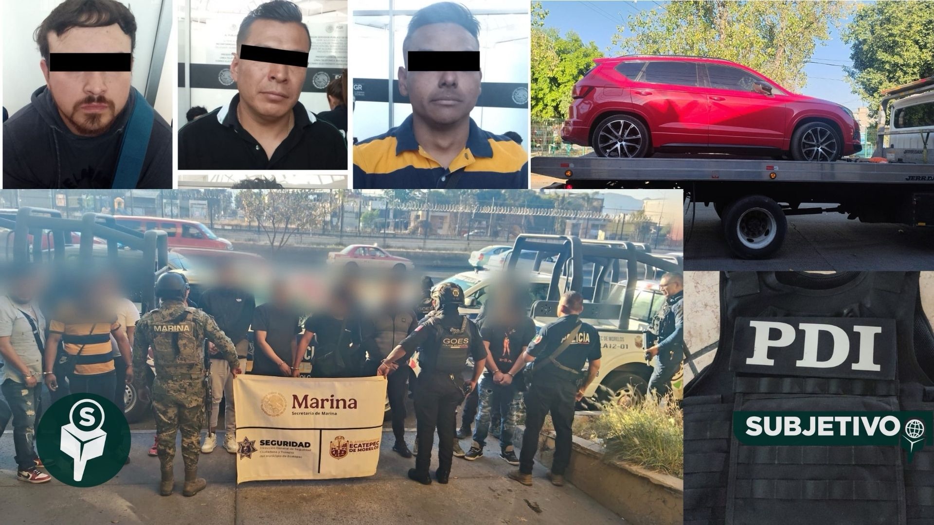 - En Ecatepec, una denuncia ciudadana detonó la caída de 10 presuntos extorsionadores que se movían en camionetas de alta gama. Tres portaban chalecos con la leyenda “PDI” y armas, pero no pertenecían a ninguna corporación.