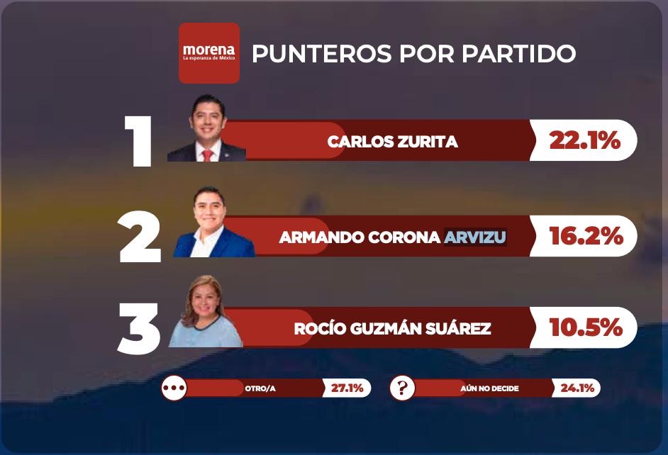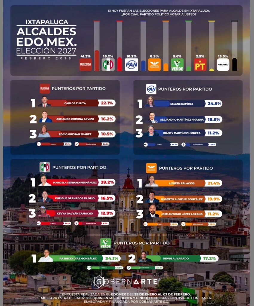- Morena domina hoy la foto rumbo a Ixtapaluca 2027. Pero el dato fino está dentro: Carlos Zurita aparece como el nombre mejor posicionado en su partido.La encuesta de GobernArte lo pone como puntero interno en un municipio donde Morena arranca con 41.3%.