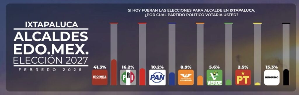 Si la elección fuera hoy, la preferencia por partido en Ixtapaluca coloca a Morena muy por arriba del resto: 41.3%, seguido del PRI (16.2%) y el PAN (10.2%).