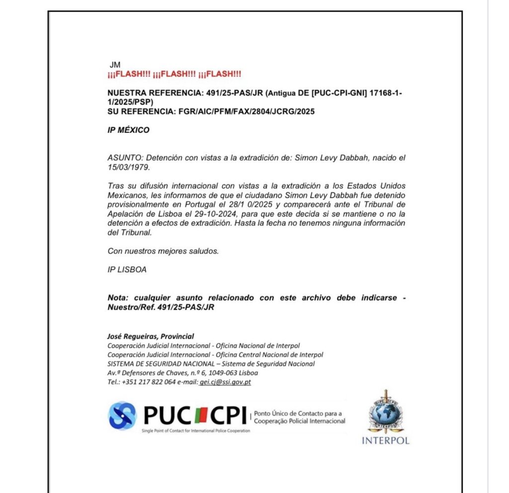 Circula un oficio de “IP Lisboa” con sellos de cooperación policial que refiere la detención y la comparecencia en Lisboa. Ojo: la filtración tiene inconsistencias de fecha (menciona 29-10-2024), por lo que su lectura debe hacerse con cautela. El dato sólido es el comunicado oficial de la FGJCDMX y la notificación de Interpol.