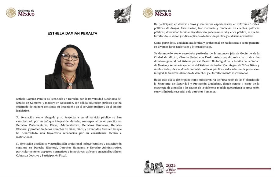 - Movimiento quirúrgico en Palacio Nacional. Esthela Damián Peralta fue designada Consejera Jurídica del Ejecutivo Federal, un cargo clave para la arquitectura legal del nuevo gobierno y la defensa normativa del proyecto de la Cuarta Transformación