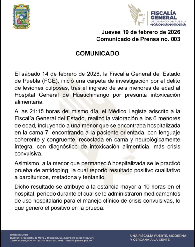 • La Fiscalía de Puebla aclaró que el positivo a fentanilo en una menor internada se explica por medicamentos hospitalarios, y que las orinas salieron negativas a drogas de abuso.
