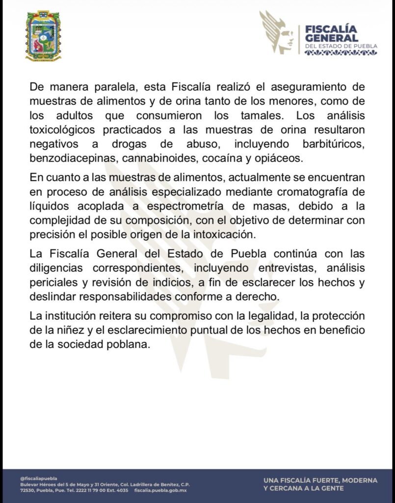 La versión viral decía que una menor terminó intoxicada por “tamales con fentanilo”. Pero la FGE Puebla informó otra cosa: el resultado positivo cualitativo (barbitúricos, metadona y fentanilo) se atribuye a una estancia mayor a 10 horas en el hospital, donde recibió medicamentos para el manejo clínico de crisis convulsivas.