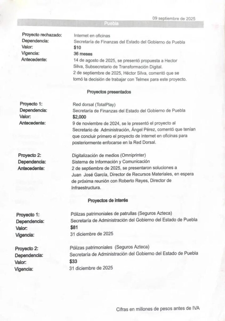 Entre los casos más relevantes aparece una propuesta de red dorsal de TotalPlay para la Secretaría de Finanzas del Estado de Puebla por 2 mil millones de pesos. En la misma relación figura también un proyecto de internet en oficinas para esa dependencia por 10 millones de pesos a 36 meses, identificado expresamente como “proyecto rechazado”. En los antecedentes se señala que la propuesta fue presentada el 14 de agosto de 2025 y que el 2 de septiembre se notificó la decisión de trabajar con Telmex para ese servicio.