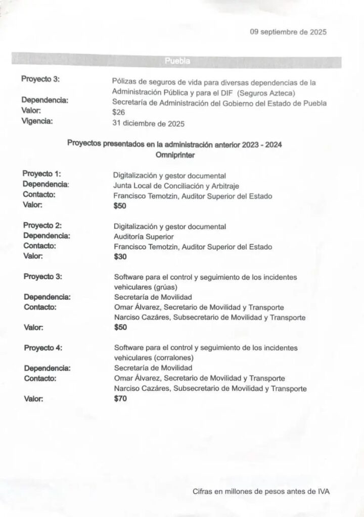 Los documentos incluyen propuestas de TotalPlay, Omniprinter y Seguros Azteca para áreas clave de la administración estatal. No se trataba de un servicio aislado, sino de un paquete de negocios en telecomunicaciones, digitalización, software y seguros con costos millonarios que habrían significado un golpe brutal al erario poblano. Además, los propios archivos remarcan un detalle clave: las cifras están calculadas antes de impuestos, es decir, el costo final todavía sería mayor.