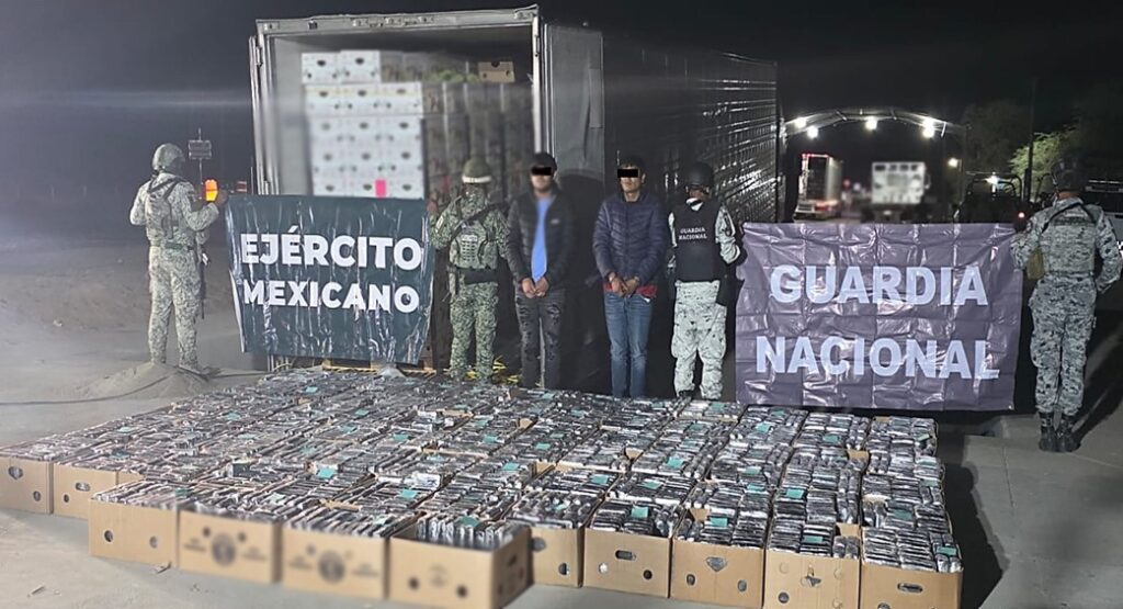 El caso más contundente se registró en San Luis Río Colorado, Sonora, donde elementos de la Guardia Nacional y el Ejército detuvieron a dos personas que transportaban 1,877 paquetes de cocaína, con un peso aproximado de un kilo cada uno, ocultos en cajas con fruta. El propio Gabinete valuó ese cargamento en 401.2 millones de pesos, convirtiéndolo en el aseguramiento económicamente más fuerte del reporte.