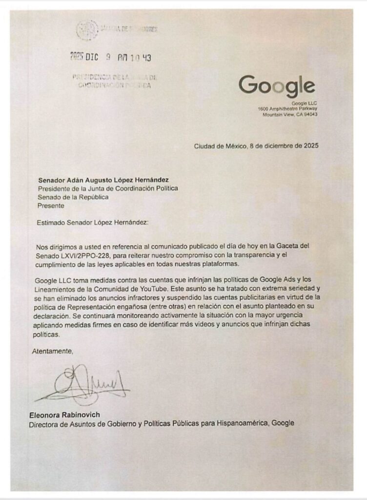 - Google LLC respondió formalmente al Senado mexicano y confirmó que ya tomó medidas contra cuentas y anuncios que violaron sus políticas de publicidad y las reglas de YouTube, particularmente por prácticas de representación engañosa.