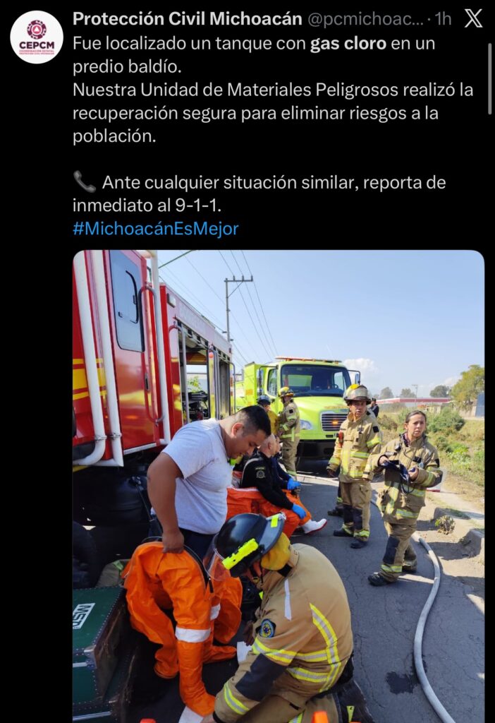 El gas cloro puede ser letal si se inhala o entra en contacto con la piel. Por eso, la localización hoy y la intervención inmediata de Protección Civil de Michoacán cerraron el riesgo y evitaron una emergencia mayor.