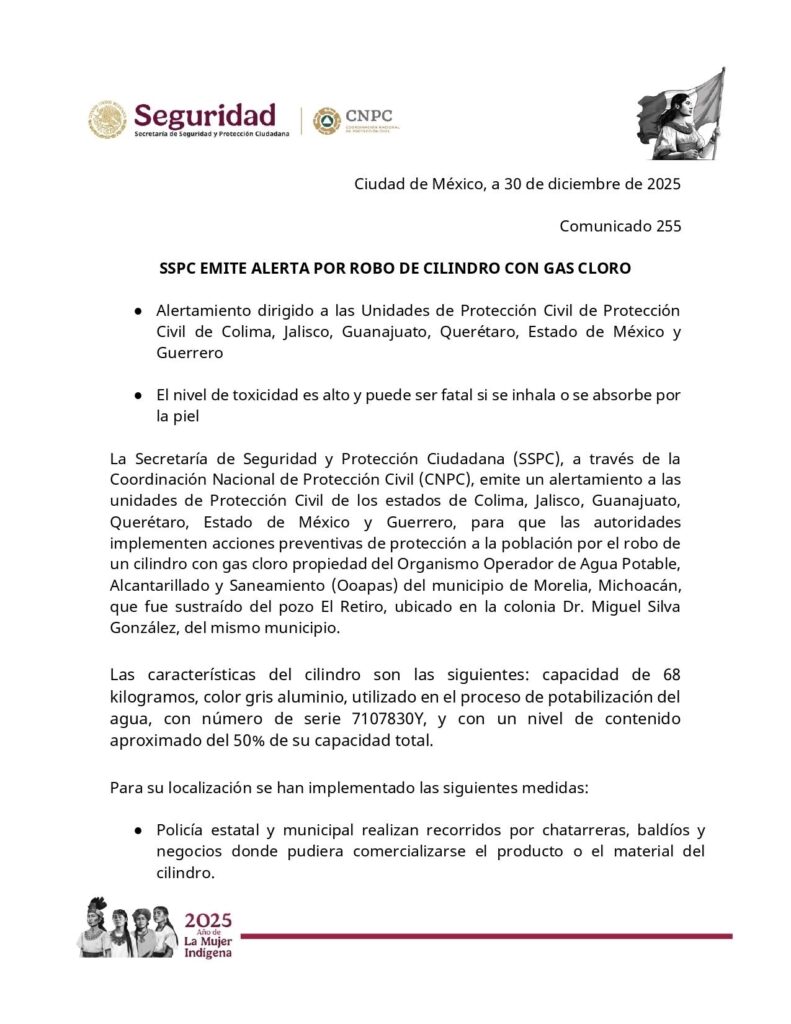 La Secretaría de Seguridad y Protección Ciudadana, a través de la Coordinación Nacional de Protección Civil, emitió el Comunicado 255 por el robo de un cilindro con gas cloro propiedad del OOAPAS de Morelia.