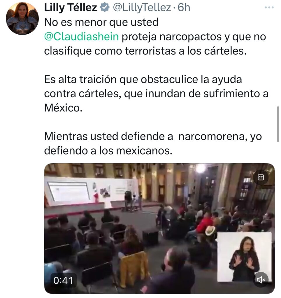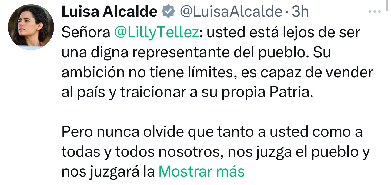 “Señora @LillyTellez: usted está lejos de ser una digna representante del pueblo. Su ambición no tiene límites, es capaz de vender al país y traicionar a su propia Patria.”