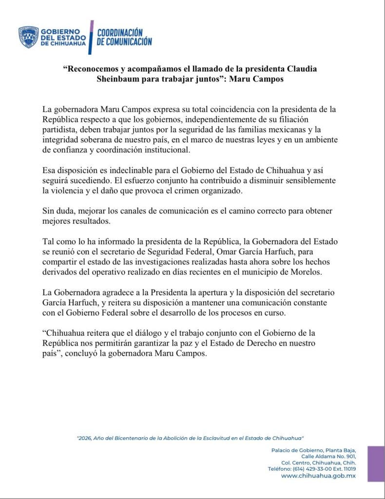 A través de un comunicado, el Gobierno de Chihuahua señaló que la coordinación institucional debe mantenerse dentro del marco legal, con confianza y comunicación entre autoridades estatales y federales.
