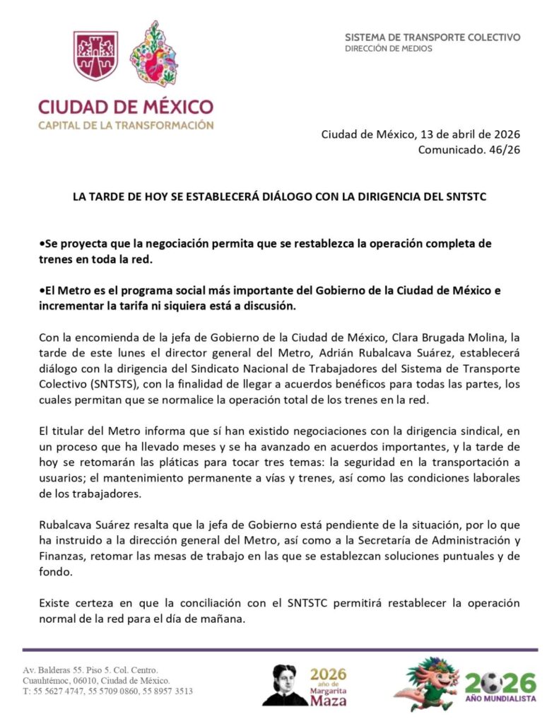 El Sistema de Transporte Colectivo Metro informó que, tras una mesa de diálogo con la dirigencia sindical, se alcanzaron acuerdos que permitirán restablecer el servicio en toda la red.