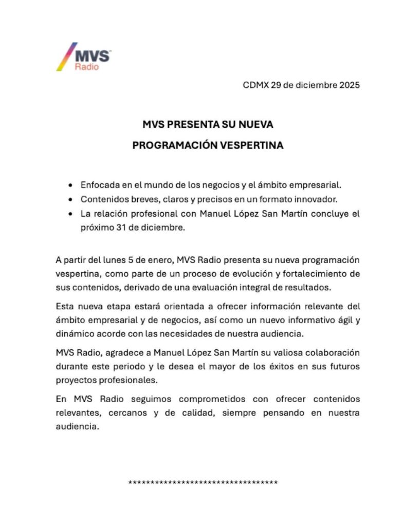 La tarde informativa de MVS Radio se sacude. A través de un comunicado oficial, la empresa confirmó que Manuel López San Martín dejará la estación al cierre de este año, como parte de un “proceso de evolución” en su programación vespertina.