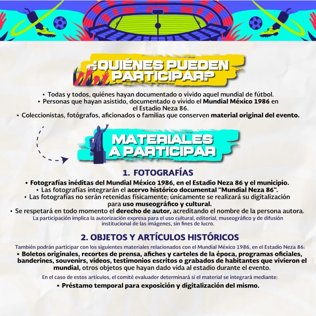 La administración municipal planteó esta exposición como uno de sus ejes culturales rumbo al Mundial de Fútbol 2026. Para ello, se integrará un Comité Receptor y Calificador que ordenará, clasificará y seleccionará los materiales que formarán parte del acervo histórico-cultural “Mundial Neza 86”.