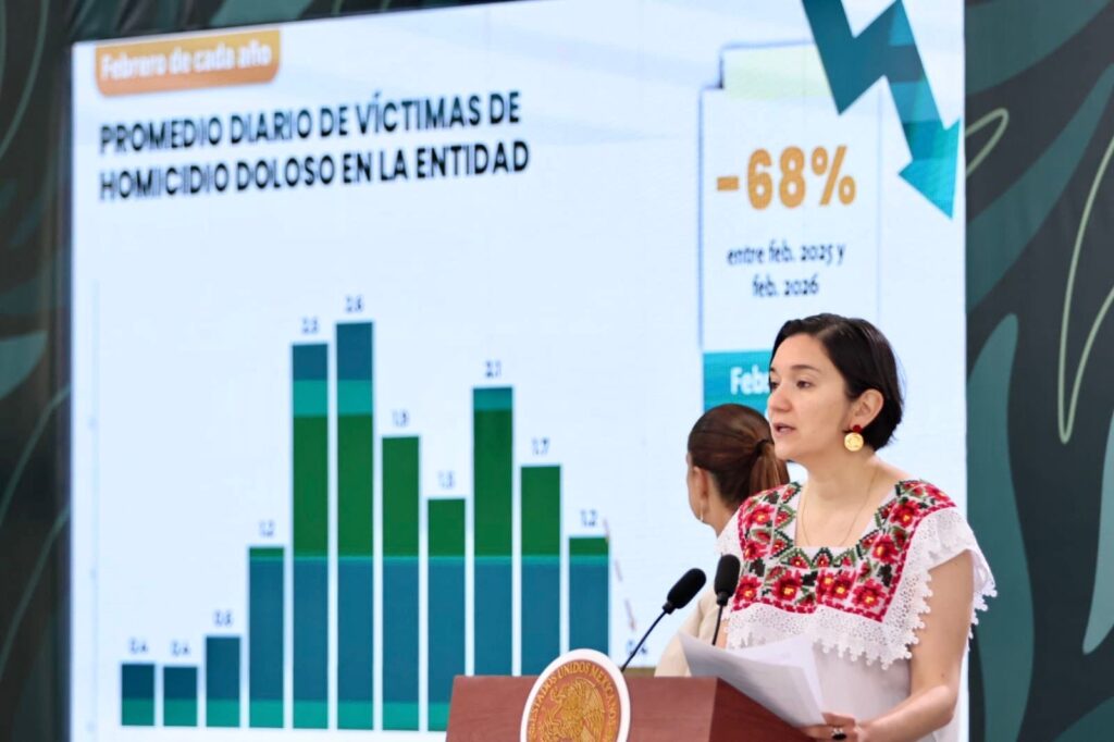 Durante la mañanera encabezada por la Presidenta Claudia Sheinbaum, la titular del Secretariado Ejecutivo del Sistema Nacional de Seguridad Pública, Marcela Figueroa Franco, detalló que entre febrero de 2025 y febrero de 2026 el promedio diario bajó de 1.2 a 0.4 víctimas, una reducción anual del 68 por ciento. A eso se suma una baja de 36 por ciento en delitos de alto impacto respecto a octubre de 2024, al pasar de 9.16 a 5.89 casos diarios en febrero de 2026.