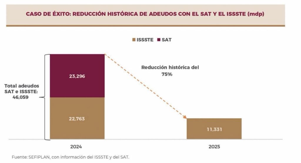 El adeudo con el ISSSTE también dio un giro de 180 grados. Pasó de más de 22 mil millones a poco más de 11 mil millones, una reducción del 50% que no tiene precedente desde que las administraciones panistas y priistas endeudaron al estado sin freno y sin vergüenza.