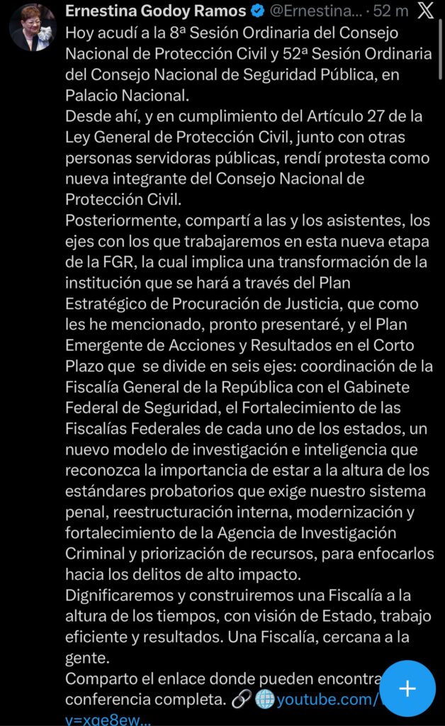 - Ernestina Godoy llegó sin titubeos a la Fiscalía General de la República. En Palacio Nacional, frente a Claudia Sheinbaum y el gabinete federal, anunció la reestructura más profunda en años: una FGR alineada a la estrategia nacional de seguridad, moderna, cercana a la gente y con cero tolerancia a la corrupción.
