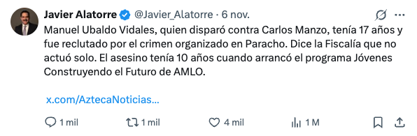 El dueño de Grupo Salinas y su vocero, Javier Alatorre, intentaron vincular al programa federal Jóvenes Construyendo el Futuro con el asesinato de Carlos Manzo, alcalde de Uruapan, Michoacán. Ambos afirmaron que el presunto responsable, Manuel Ubaldo Vidales, era becario del programa. La narrativa se cae sola: el joven tiene 17 años y el programa solo admite personas de 18 a 29 años. El propio Alatorre reconoció en redes que Ubaldo tenía apenas 10 años cuando el plan arrancó en 2019.