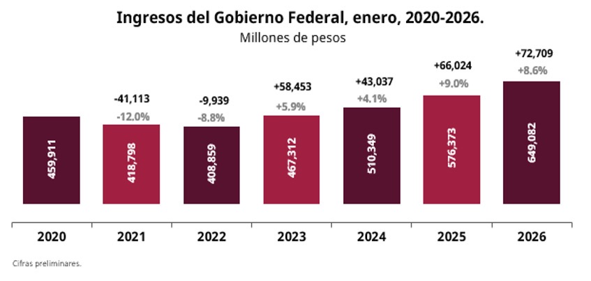 De acuerdo con el reporte, los ingresos tributarios sumaron 595 mil 758 millones de pesos en enero. La cifra representa un aumento en términos reales respecto a 2025 y un cumplimiento superior al calendario previsto en la Ley de Ingresos de la Federación.