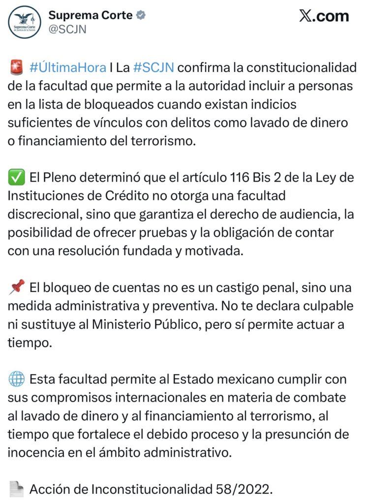 La Suprema Corte de Justicia de la Nación confirmó la constitucionalidad de la facultad para incluir personas en la lista de bloqueados cuando existan indicios de vínculos con delitos como lavado de dinero o financiamiento al terrorismo.