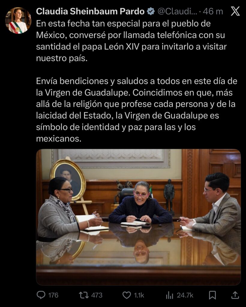 Desde su cuenta oficial en X, la Presidenta informó que sostuvo una llamada telefónica con el Papa León XIV en una fecha clave para millones de mexicanas y mexicanos. No fue pose ni ocurrencia: fue diplomacia simbólica bien leída.