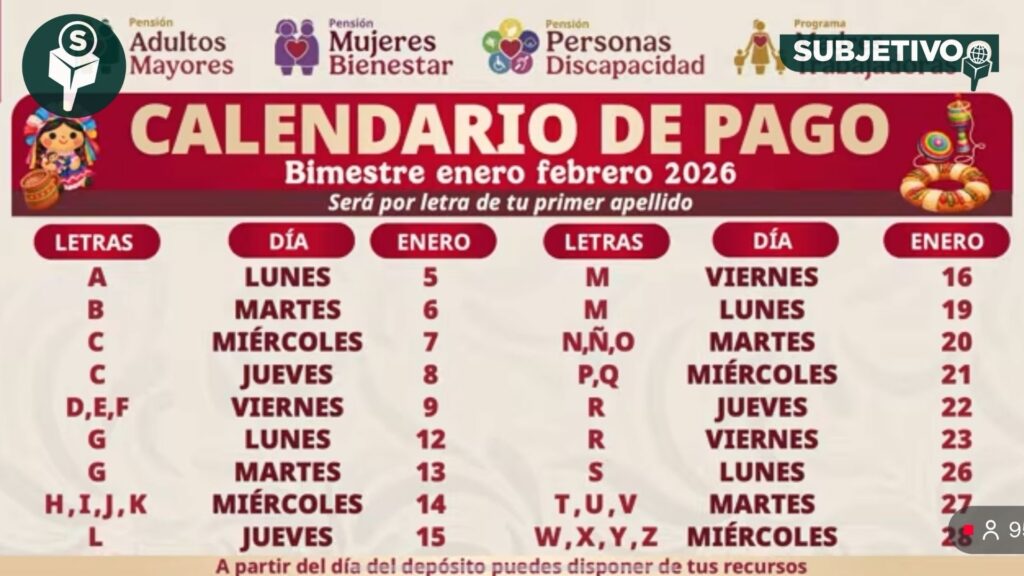 Consulta el calendario de pagos Bienestar enero–febrero 2026. Fechas oficiales por letra del apellido.