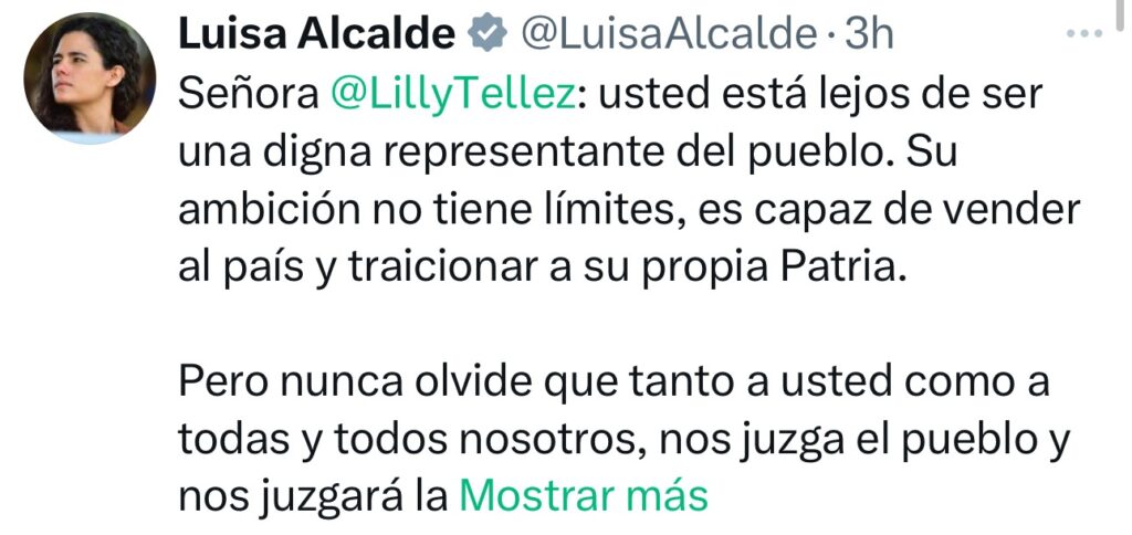 Luisa Alcalde responde a Lilly Téllez en X: la acusa de ambiciosa y de traicionar a la patria. La morenista se llevó la victoria política en redes