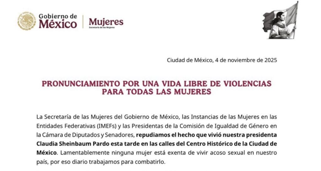 Gobierno de México condena el acoso a Claudia Sheinbaum y llama a no trivializar la violencia contra las mujeres. “Ninguna está exenta”, afirma.