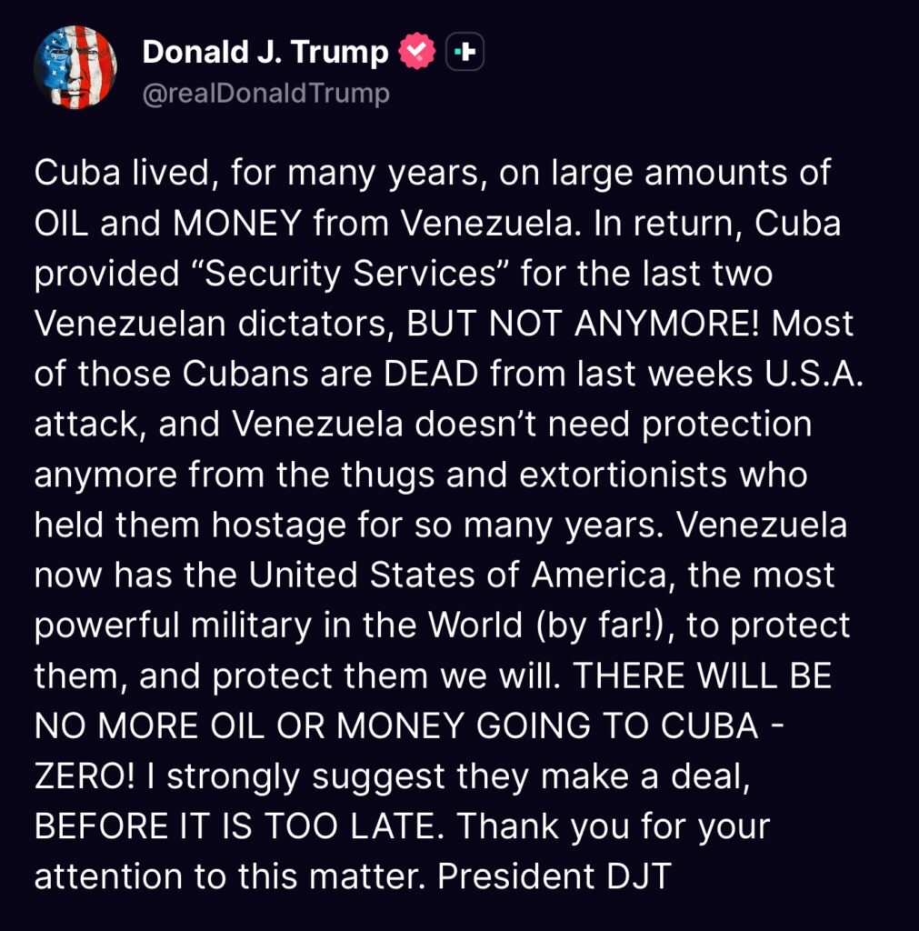 En un mensaje cargado de intimidación, Trump aseguró que Cuba “vivió” del petróleo y dinero venezolano a cambio de supuestos “servicios de seguridad” y afirmó que eso terminó tras un ataque reciente de Estados Unidos. Remató con advertencias económicas y una “sugerencia” de negociar “antes de que sea demasiado tarde”.