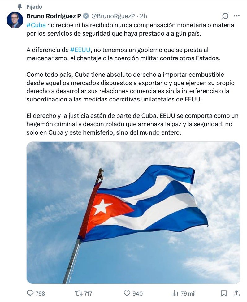 La cancillería cubana salió al paso. Bruno Rodríguez Parrilla negó que Cuba reciba —o haya recibido— compensación monetaria o material por “servicios de seguridad” a otros países. Subrayó que La Habana no practica mercenarismo, chantaje ni coerción militar, y contrastó esa postura con la conducta de Estados Unidos.